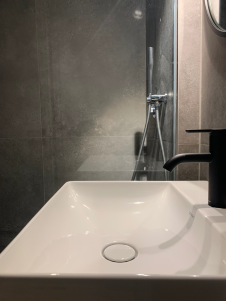 • neues Duschbad mit großformatigen Fliesen in Betonoptik und einer bodengleichen XL Duschwanne (Maße 150cm x 80cm) und Regenschauer-Duschkopf. Die exklusiven Badobjekte samt Armaturen sind von namhaften Herstellern: Duravit, Philipp Starck, Villeroy & Boch und Hansgrohe.