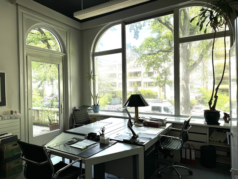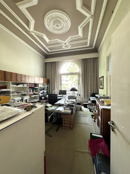 Das Büro besteht aus zwei großen Räumen, mit kleiner Pantryküche und einer Veranda mit angrenzendem Balkon. Im Kellergeschoss befindet sich noch ein WC, das ausschließlich dem Büro (Sondernutzung) zugewiesen ist. Das Büro befindet sich in seinem ursprünglichen Zustand. Die historischen Räumlichkeiten, mit hohen Decken und imposanten Stuckelementen, bieten daher die perfekte Ausgangssituation, um diese nach Ihren Wünschen