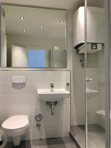 Das innenliegende Duschbad ist zeitlos in weiß gefliest und verfügt über einen modernen Warmwasserspeicher. Für eine optimale Beleuchtung im Duschbad sorgen die in die Decke eingelassenen Spots.
