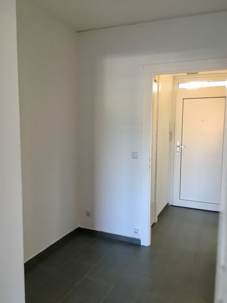 Im Wohn- und Schlafzimmer wurde Laminatboden verlegt. Der Flur, die Küche und das Duschbad sind in grau gefliest.