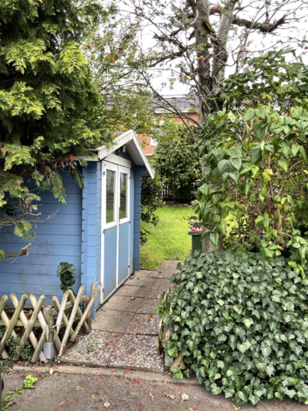 Das schön eingewachsene Grundstück ist ca. 148m² groß, ein langer Grünstreifen mit einem kleinen Gartenhäuschen.