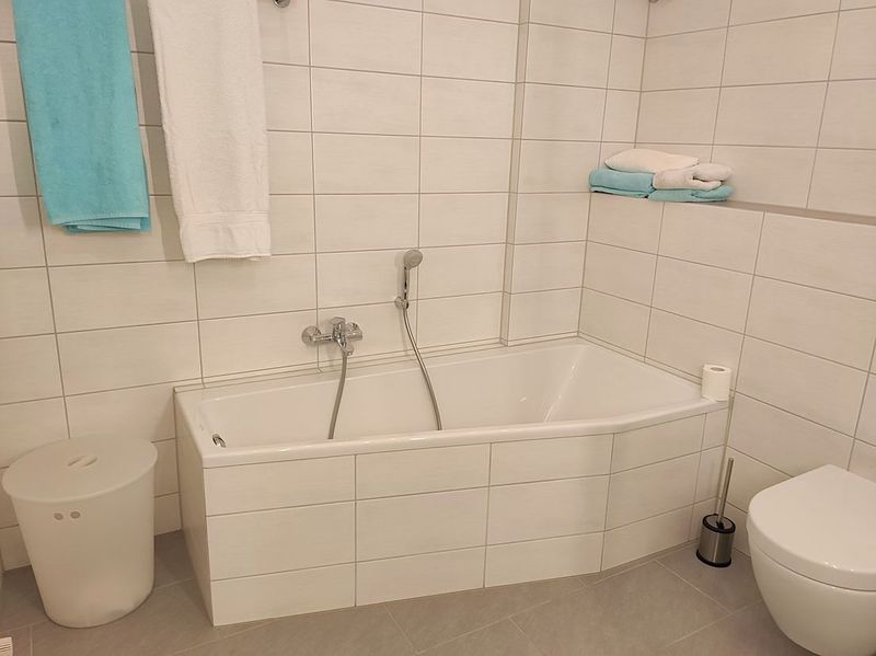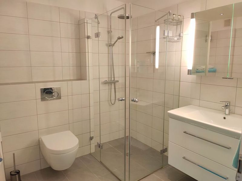 - ein neu renoviertes Badezimmer mit Badewanne, ebenerdiger Dusche, Handtuchheizkörper und Fußbodenheizung